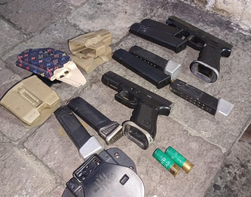 De inmediato el 110 coordinó con policías de las comisarías de la capital logrando interceptar dos vehículos en el kilómetro 24 ruta al Atlántico, una camionetilla P-120JZQ, marca Honda y un pickup P-678KGY, donde fueron detenidos Christopher de 21 años, Felipe “de 40 años y Juan de 38 años, al revisarlos se les decomisa dos pistolas Glock y varios cargadores y 107 municiones útiles, armas cuentan con licencia