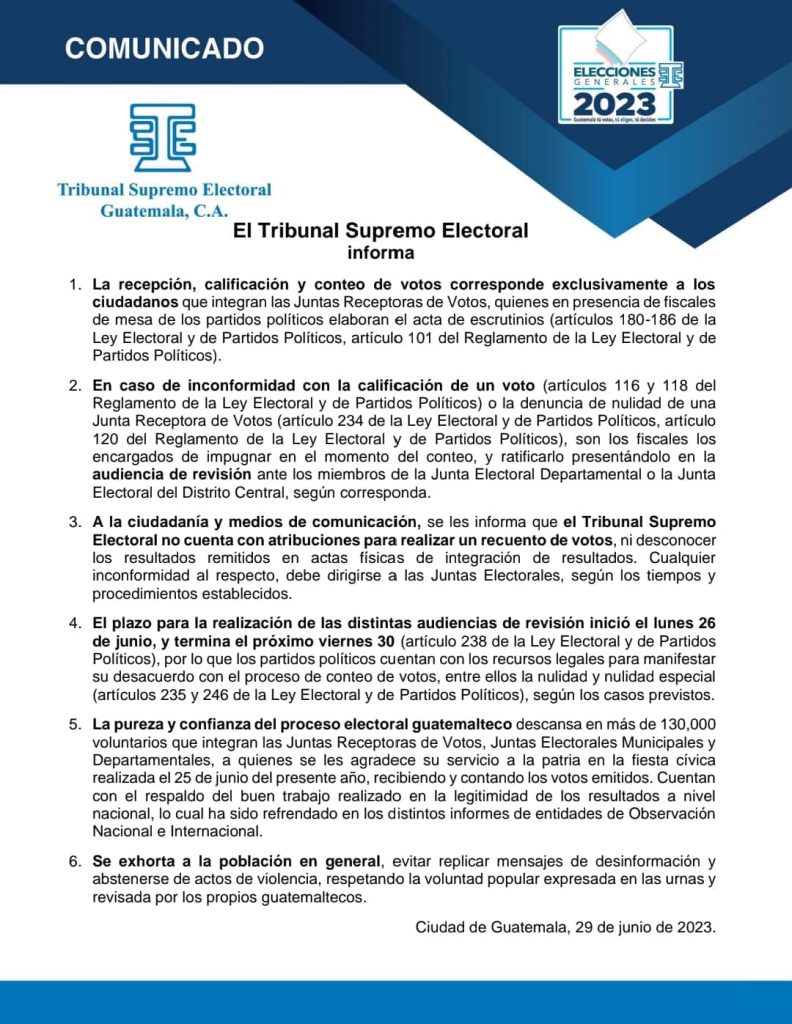 El Tribunal Supremo ElectoralTSE asegura en un comunicado que «no cuenta con atribuciones para realizar un recuento de votos» ni «desconocer los resultados remitidos en actas físicas de integración de resultados». Agrega que inconformidades deben dirigirse a las Juntas Electorales según «tiempos y procedimientos establecidos».