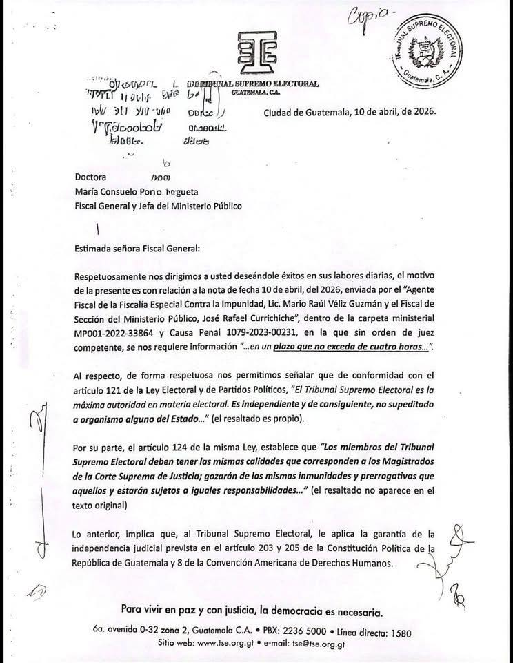 Respetuosamente nos dirigimos a usted deseándole éxitos en sus labores diarias, el motivo de la presente es con relación a la nota de fecha 10 de abril, del 2026, enviada por el «Agente Fiscal de la Fiscalía Especial Contra la Impunidad, Lic. Mario Raúl Véliz Guzmán y el Fiscal de Sección del Ministerio Público, José Rafael Currichiche», dentro de la carpeta ministerial MP001-2022-33864 y Causa Penal 1079-2023-00231, en la que sin orden de juez competente, se nos requiere información «..en un plazo que no exceda de cuatro horas…».