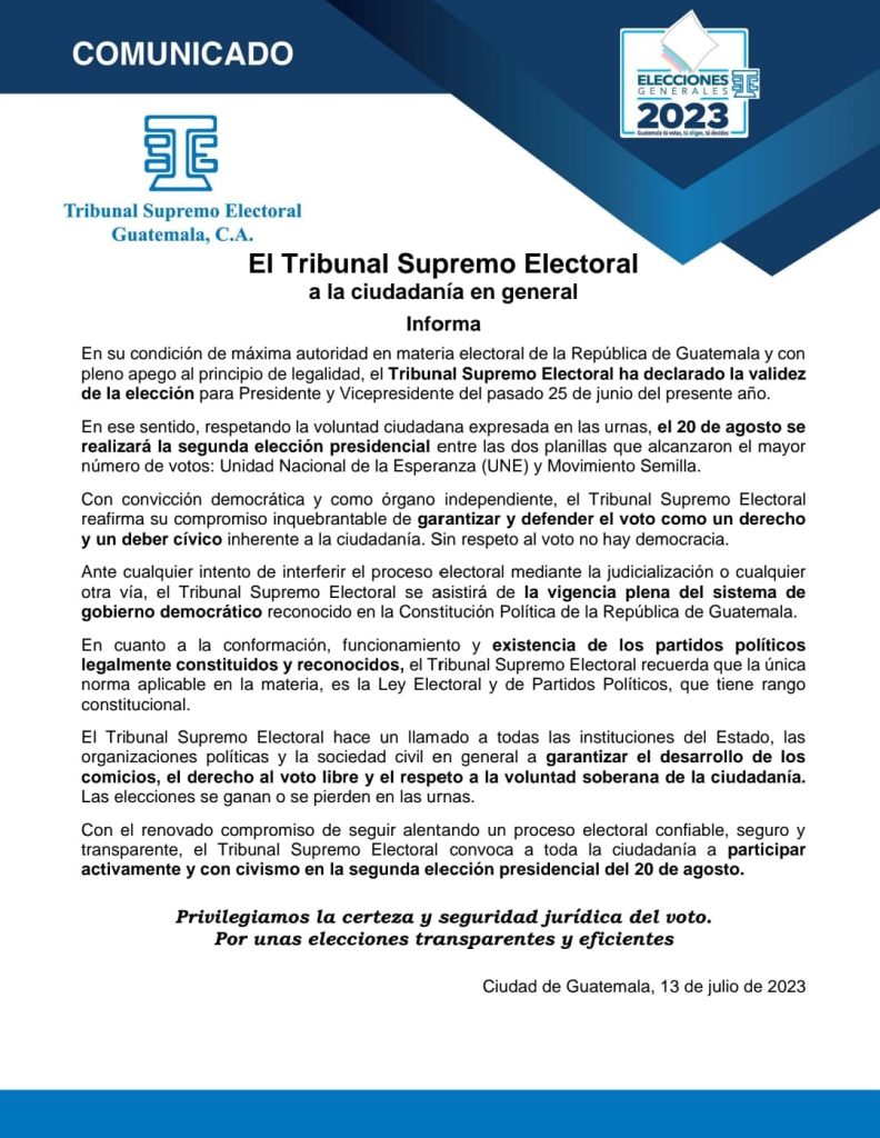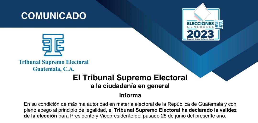 El Tribunal Supremo Electoral, ante las últimas acciones realizadas por el Ministerio Público y el Juzgado Séptimo de Instancia Penal, y en su condición de máxima autoridad en materia electoral de la República de Guatemala y con pleno apego al principio de legalidad, ha declarado la validez de las elecciones para presidente y vicepresidente, realizadas el pasado 25 de junio y continúa con los preparativos para la segunda vuelta entre Sandra Torres y Bernardo Arévalo.