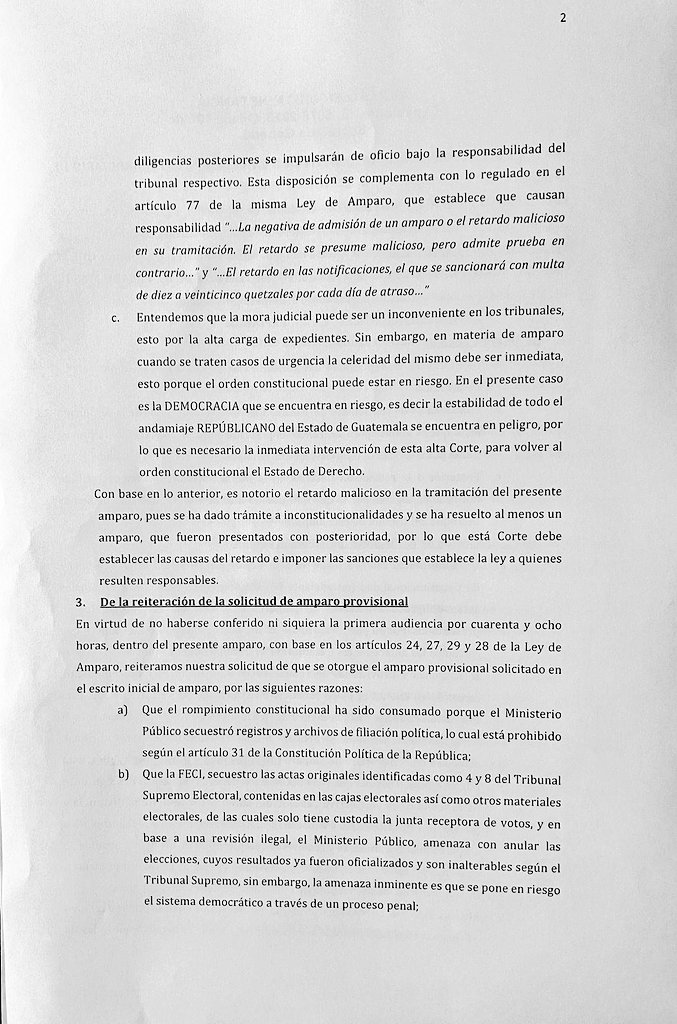 En el amparo está también el secuestro de las actas originales 4 y 8 del Tribunal Supremo Electoral, TSE, por medio de la FECI, así como materiales electorales, de las cuales solo tiene custodia la junta receptora de votos, y en base a una revisión ilegal, el MP amenaza con anular las elecciones, cuyos resultados ya fueron oficializados y son inalterables según el TSE, sin embargo, señala el documento, la amenaza inminente es que se pone en riesgo el sistema democrático a través de un proceso penal.