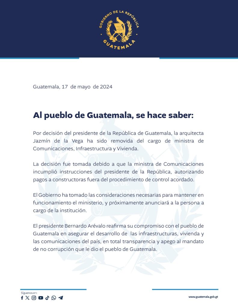El Presidente de la República Bernardo Arévalo a destituido a la ministra de comunicaciones Jazmin de la Vega por realizar pagos a constructoras algunas que dejaron obras paralizadas o sobrevaloradas las mismas