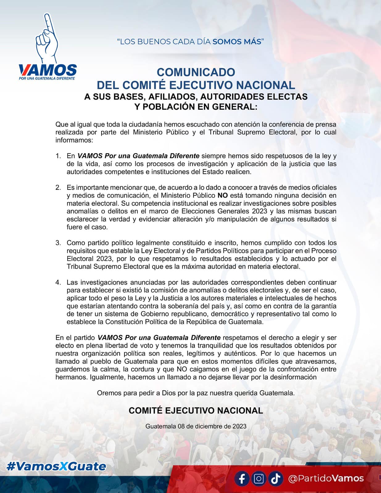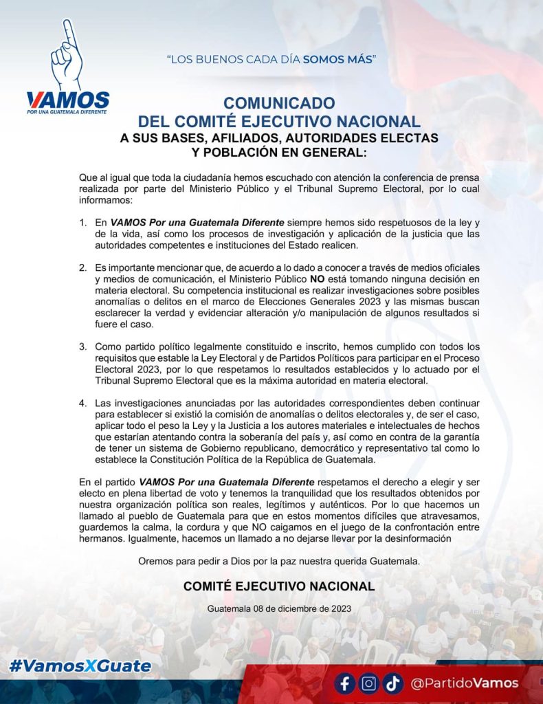En el partido VAMOS Por una Guatemala Diferente respetamos el derecho a elegir y ser electo en plena libertad de voto y tenemos la tranquilidad que los resultados obtenidos por nuestra organización política son reales, legítimos y auténticos. Por lo que hacemos un llamado al pueblo de Guatemala para que en estos momentos difíciles que atravesamos, guardemos la calma, la cordura y que NO caigamos en el juego de la confrontación entre hermanos. Igualmente, hacemos un llamado a no dejarse llevar por la desinformación