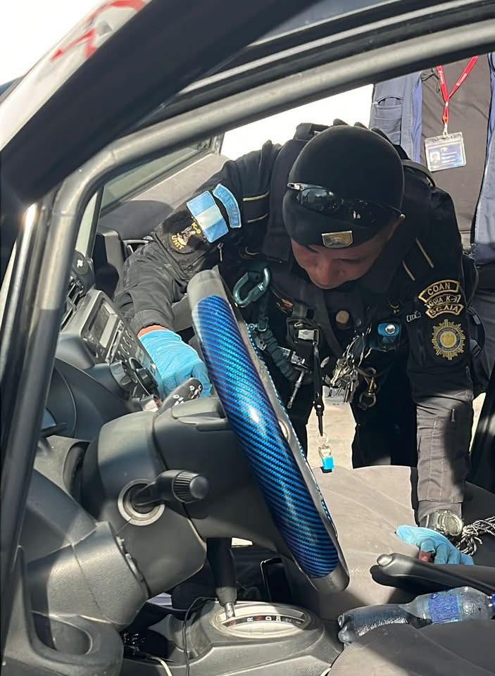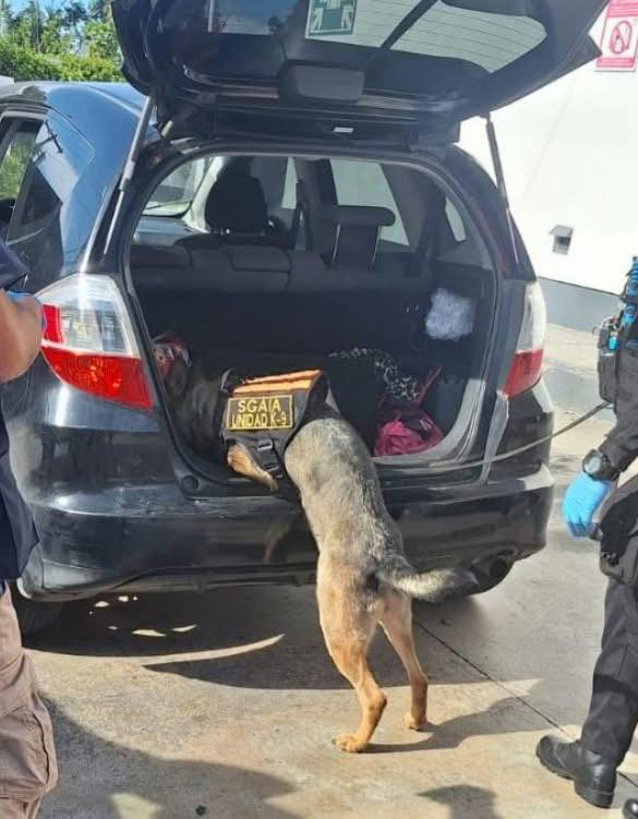 Equipos antidrogas de la SGAIA, inspeccionan un automóvil, P-385KXG, marca Honda. En el interior del automotor se observan varios paquetes de posible droga. Preventivamente hay tres hombres bajo custodia, entre ellos un venezolano.