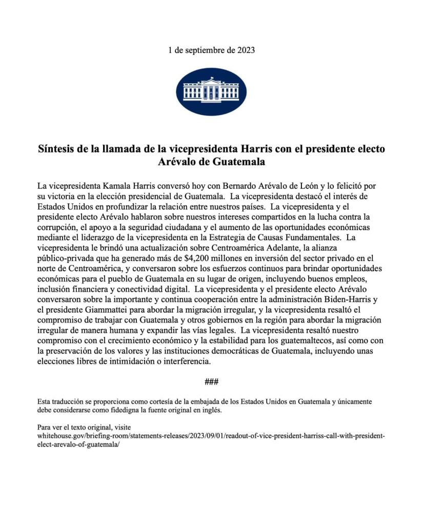 “La vicepresidenta y el presidente electo Arévalo hablaron sobre nuestros intereses compartidos en la lucha contra la corrupción, el apoyo a la seguridad ciudadana y el aumento de las oportunidades económicas mediante el liderazgo de la vicepresidenta en la Estrategia de Causas Fundamentales” expresa una tradición proporcionada por la Embajada de los Estados Unidos en Guatemala.