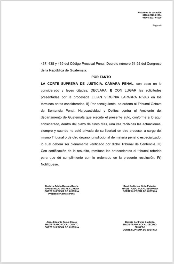La Cámara Penal de la Corte Suprema de Justicia CSJ a ordenado este martes al Tribunal 8o. otorgarle la libertad a Virginia Laparra.